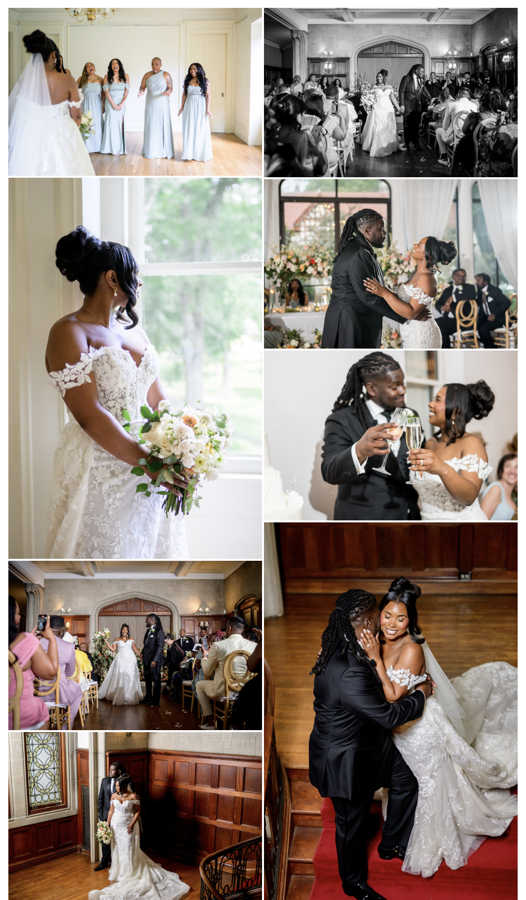 The day began under clear skies, setting the tone for a beautiful ceremony on the grounds. When a light rain rolled in later, it only added to the romance as the celebration transitioned seamlessly indoors, a true testament to thoughtful planning and a flexible design. Dominique looked stunning in an off-the-shoulder lace gown by Winnie Couture, paired with an elegant updo and soft glam makeup. The bridal party complemented the estate perfectly, with bridesmaids in mint green Birdy Grey dresses and the groom and groomsmen in classic black suits and ties.